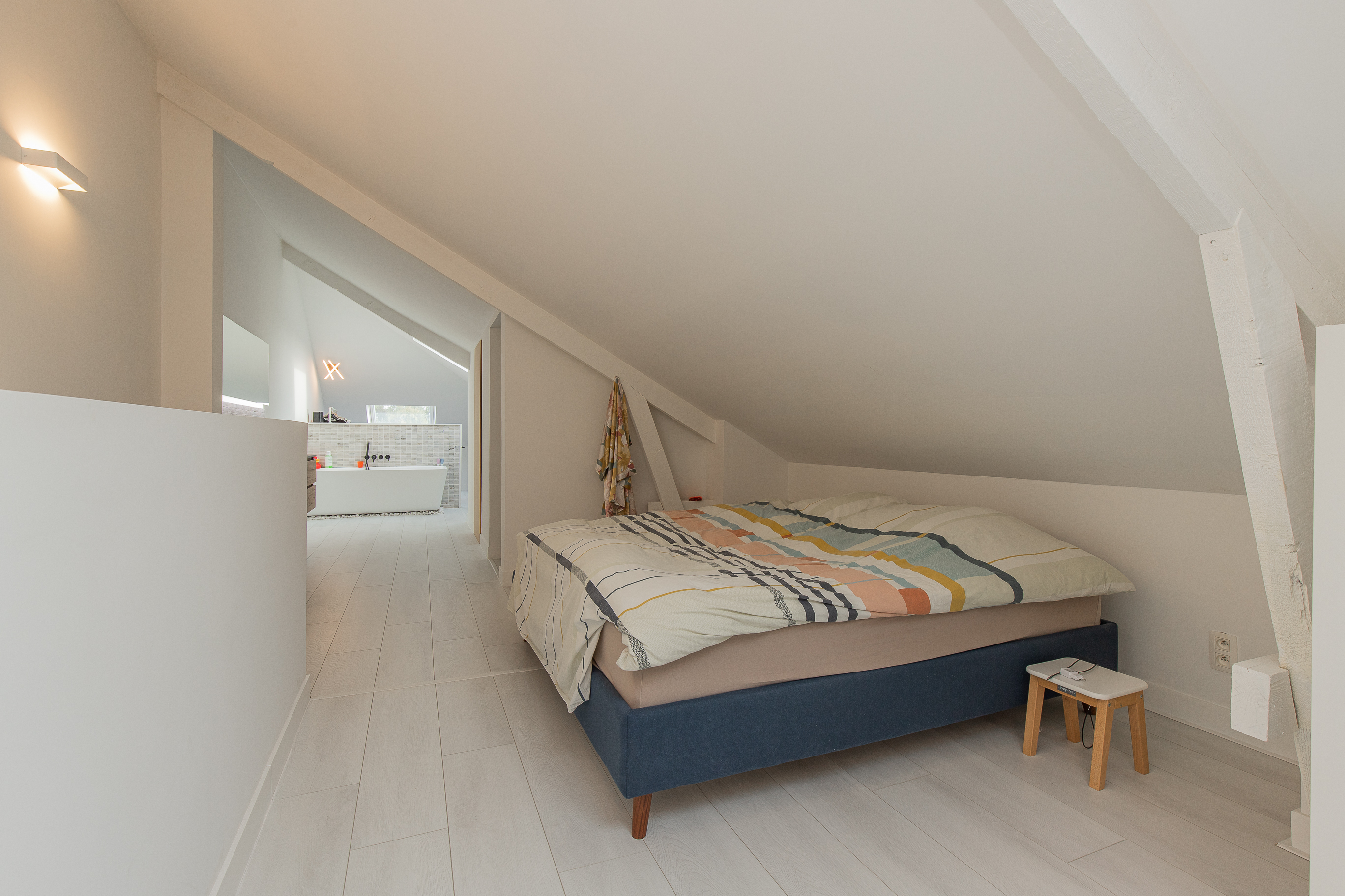 • Op de bovenverdieping: een mooie studio met slaapkamer, toilet, bad, vestiaire, wasmachine-aansluiting en stijlvolle lavabo