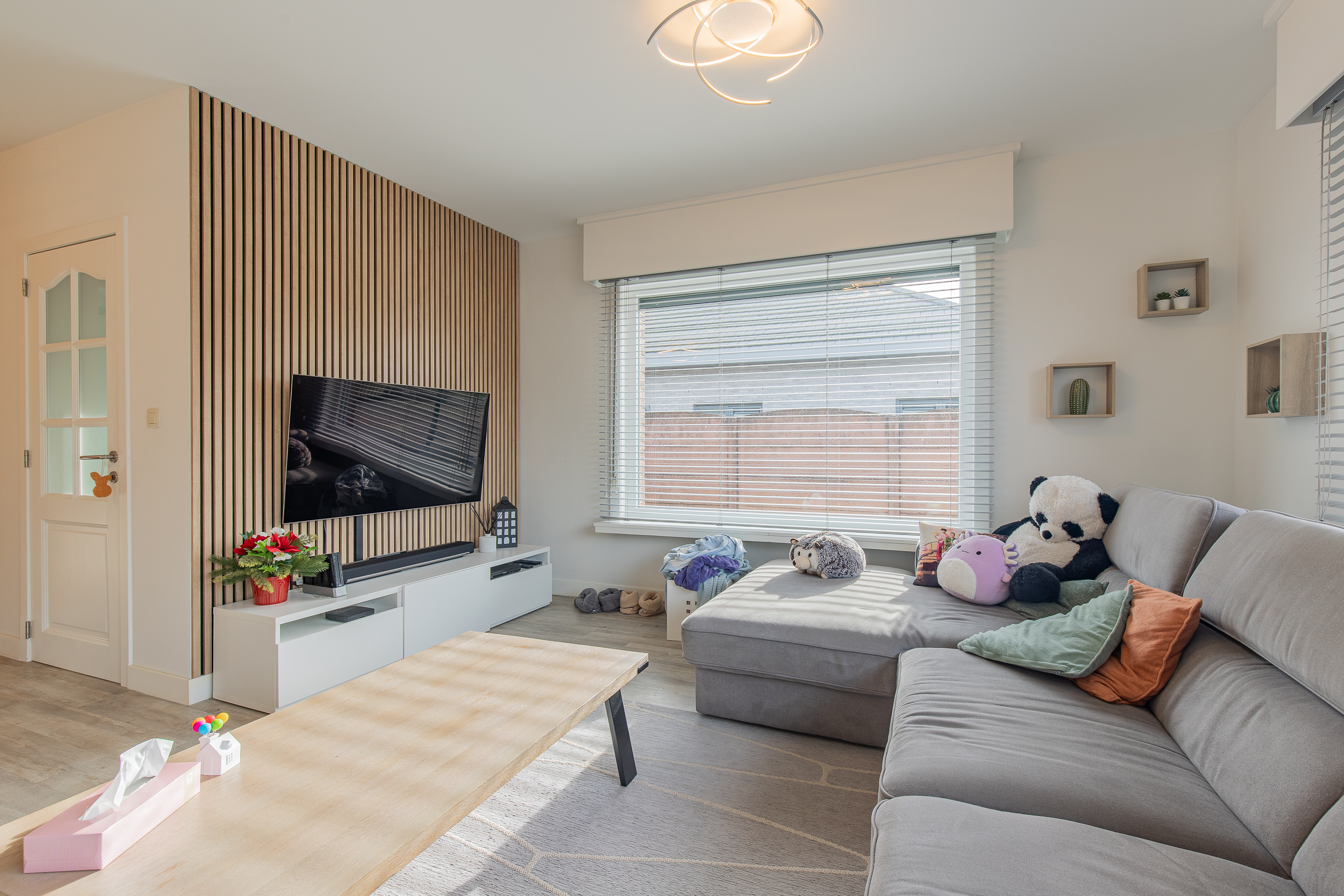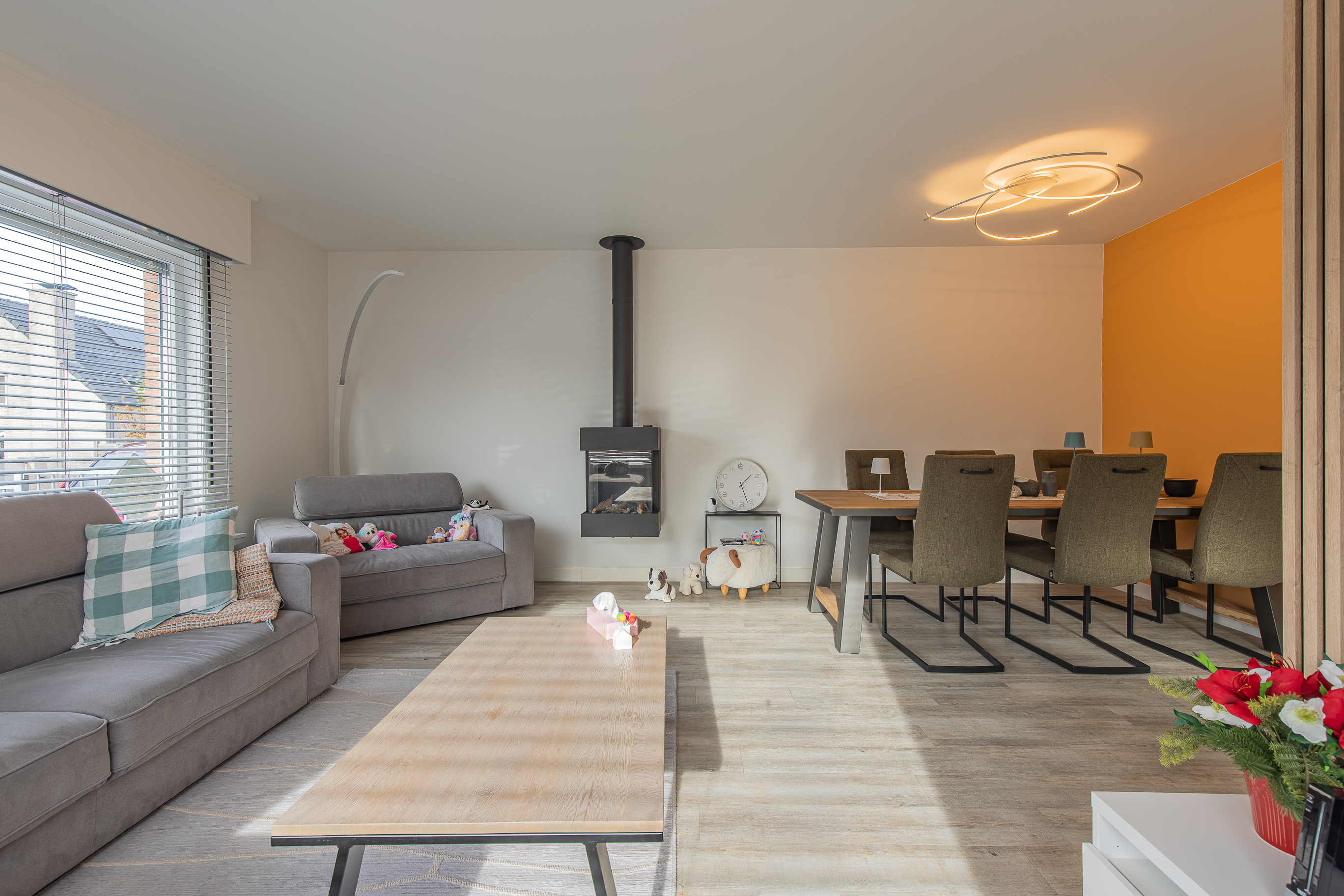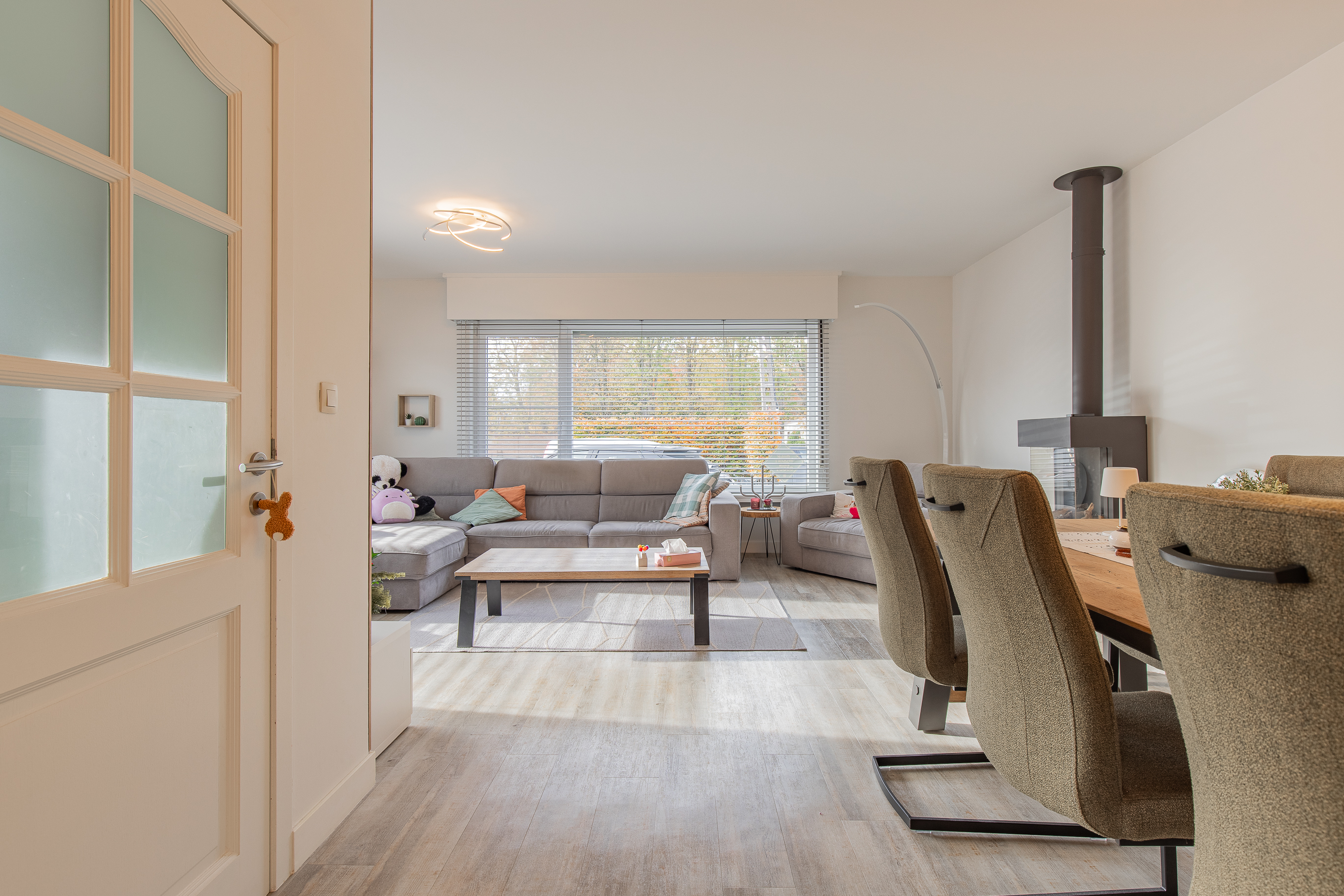 • Gezellige inkomhal met ruimte voor schoenen en een warme, lichtrijke leefruimte met grote ramen