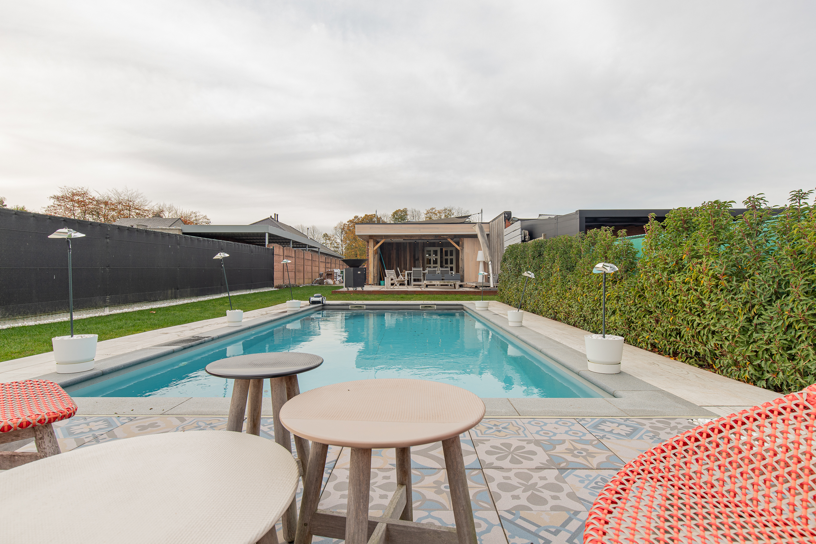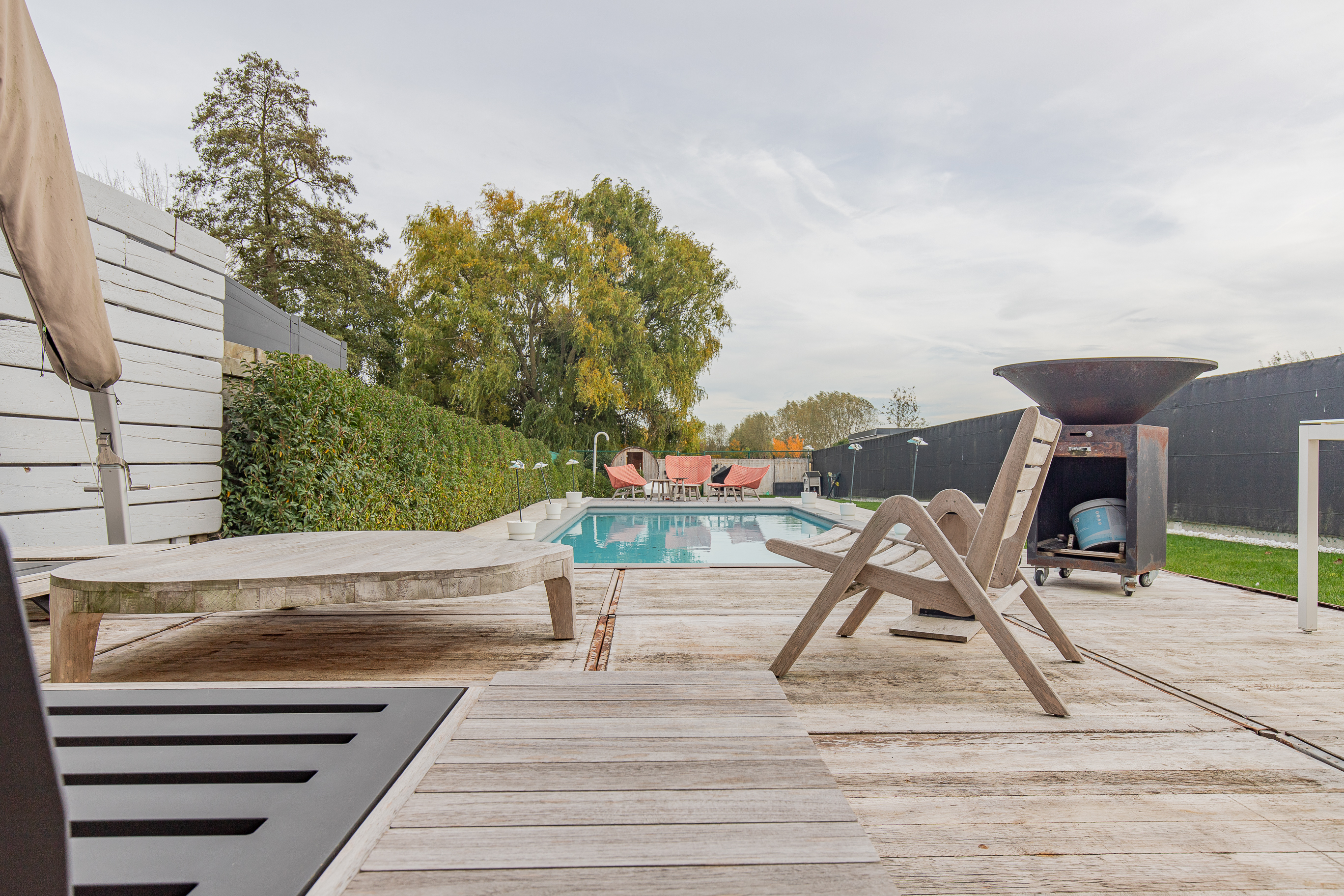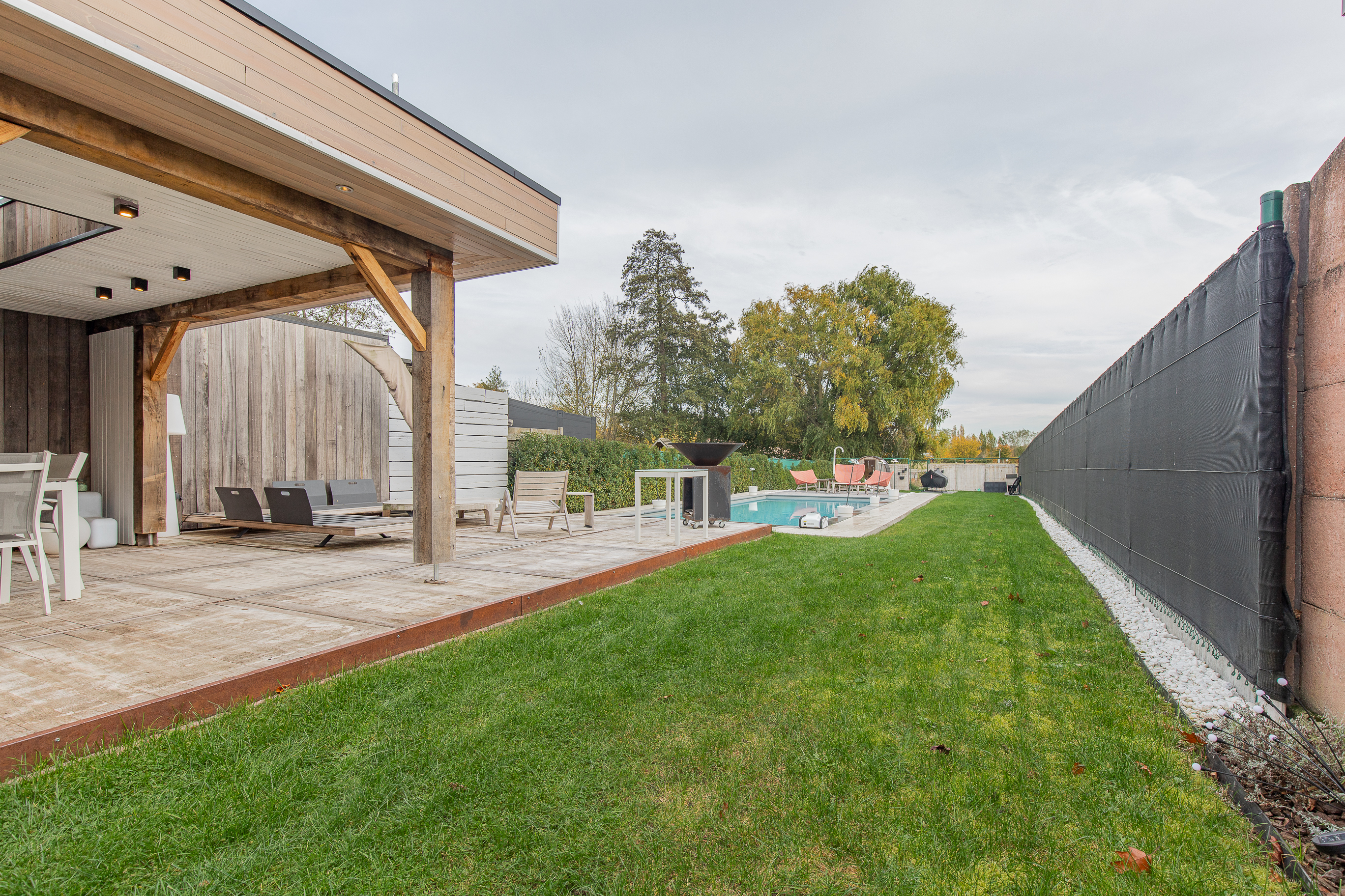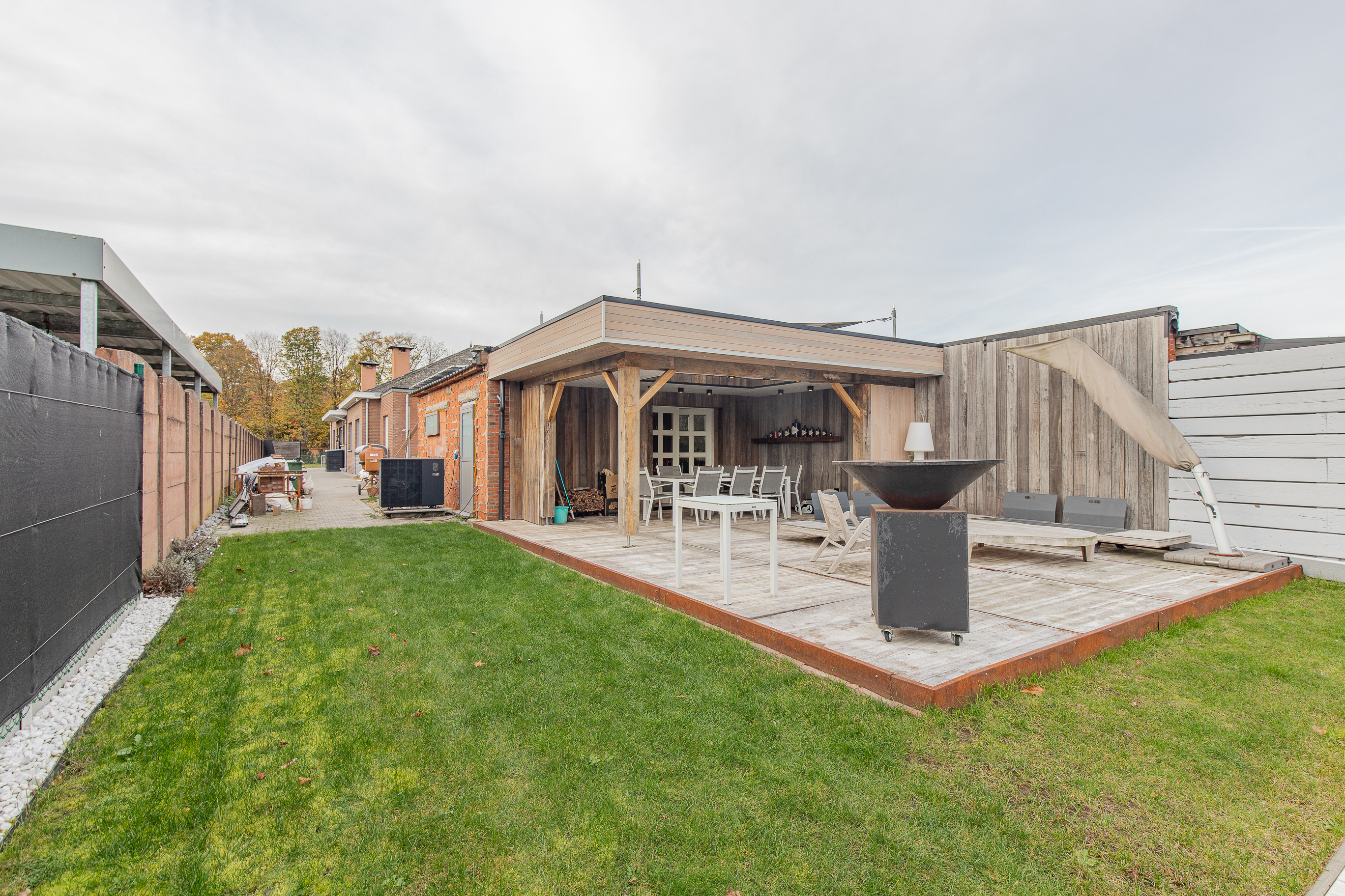 • Grote tuin met overdekt houten terras dat een warm en gezellig gevoel uitstraalt
